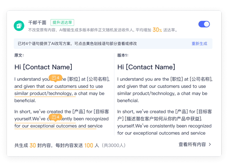 AI智能生成多版本邮件,随机发送收件人, 避免内容千篇一律,平均提升50%送达率