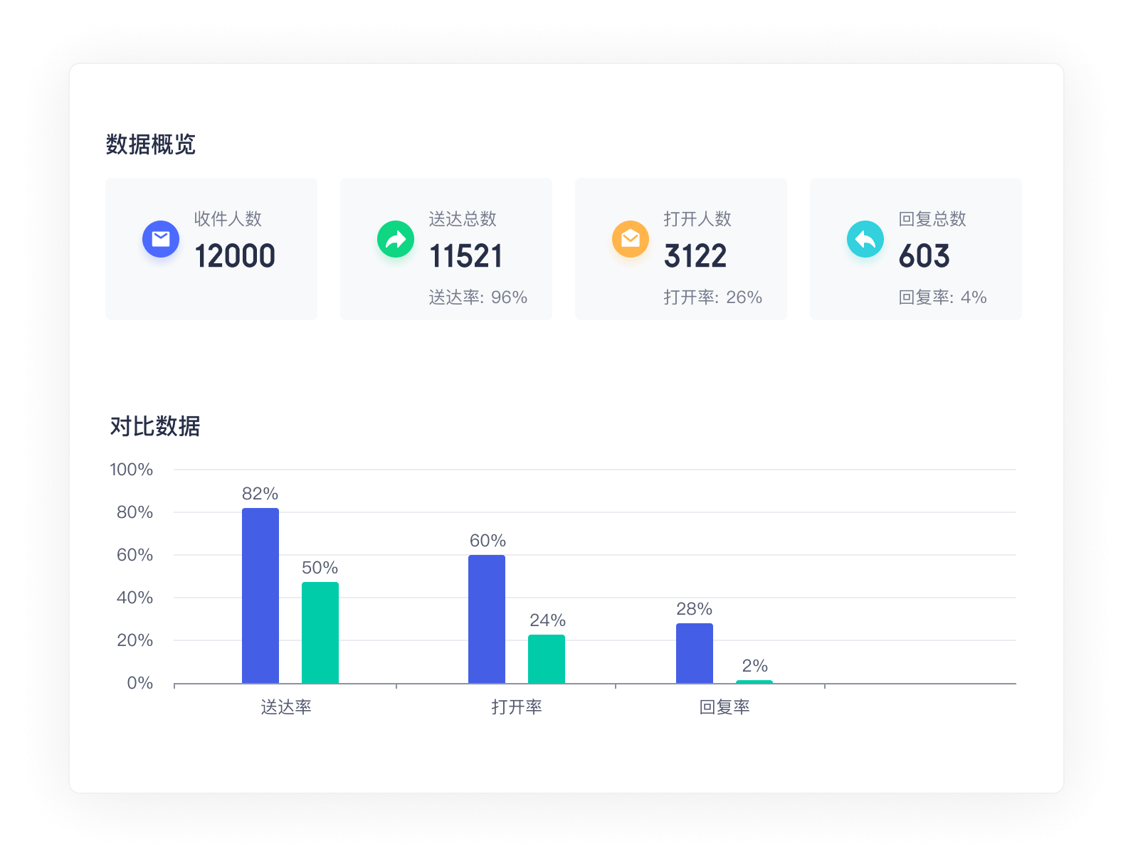 大盘数据和详情数据实时更新,送达、打开、点击、回复、失败、退订等数据一目了然、清晰直观